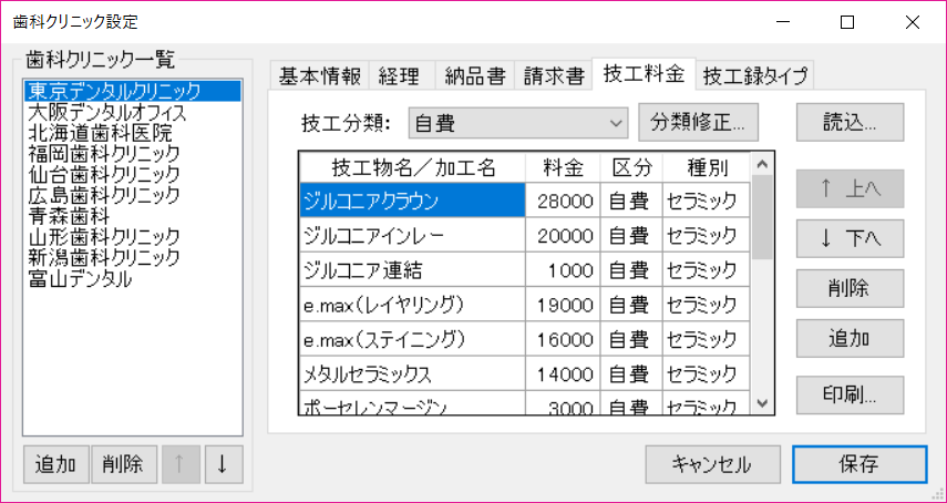 もちろん技工料金は個別に設定できます。他のクリニックと金額をあわせたり、技工料金の一覧も印刷できます。
